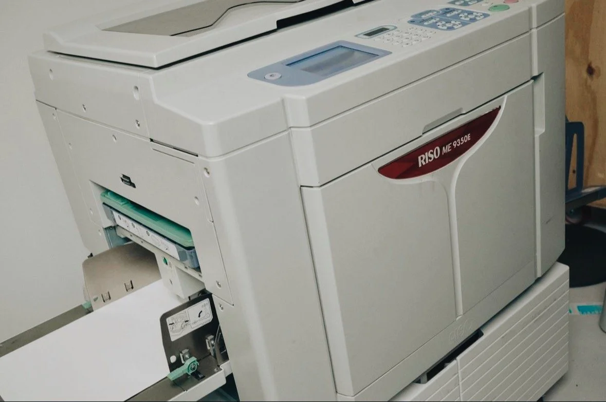 Risograph printing can be described as a form of “digital screen printing.” While the process closely resembles traditional screen printing, it offers the ease and efficiency of an office copier. It is celebrated for its vibrant colors, which are often unachievable with standard printers—and its distinctive textures. Risograph machines embrace “perfect imperfections,” making them an affordable and accessible way to produce large quantities of work such as prints, posters, invitations and zines.
